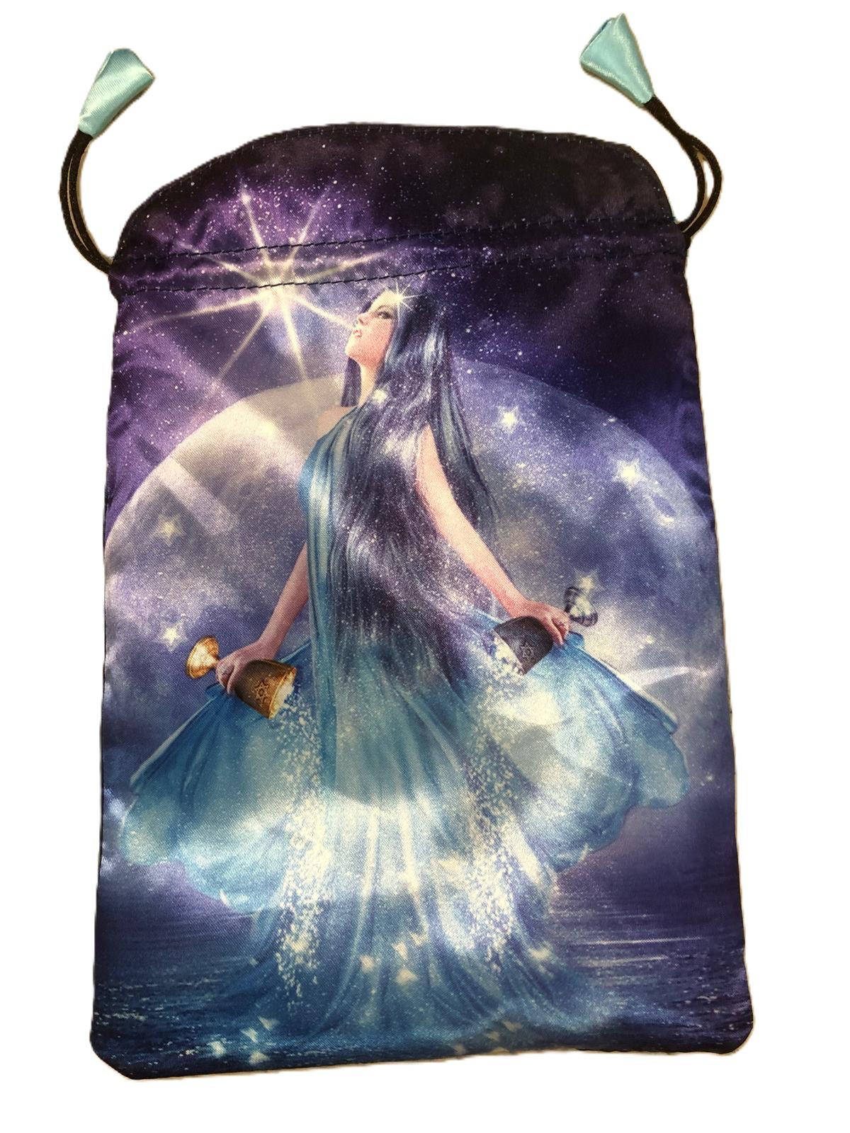 Bolsa de cetim com reforço interno, inspirada na carta A Estrela (The Star) do tarot, um símbolo de luz, esperança e renovação espiritual. A imagem mostra uma figura feminina celestial, de longos cabelos e vestido fluido, derramando água de duas taças douradas — um gesto simbólico de purificação e harmonia entre o espiritual e o terreno. O cenário cósmico com estrelas e brilho intenso evoca paz interior, intuição e conexão com o divino. Ideal para proteger seus baralhos de tarot, oráculos ou runas, unindo energia mística e sofisticação em um só acessório.